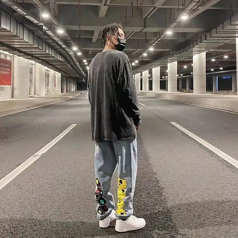 Loose Wide-Leg Jeans with Dice Cheese Print